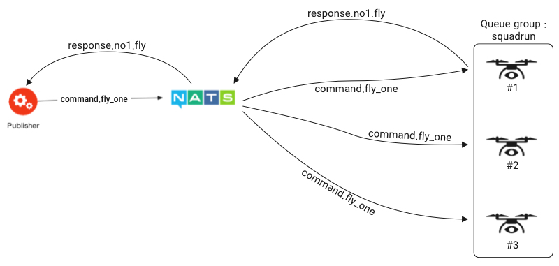 برای ساخت یک queue group هریک از کلاینتها باید یک نامگروه مشخص را ثبتنام کرده و روی یک موضوع عملیات انجام دهند. همه کلاینتهایی که نام گروه مشترکی دارندُ با هم تشکیل یک گروه میدهند. این کار به جز نامگروه همسانُ به هیچ تنظیماتی نیاز ندارد. حال هنگامی که یک پیام برای آن موضوع منتشر میشودُ یکی از اعضای گروه به صورت تصادفی انتخاب شده و پیام را دریافت میکند. به عبارت دیگر با اینکه همه اعضای گروه در حال گوش کردن به آن موضوع خاص هستند، فقط و فقط یکی از اعضا آن پیام را دریافت یا به عبارتی پردازش میکند. این الگو ایدهآلترین الگو برای scale کردن میکروسرویسها میباشد. در این روش scale-up کردن سیستم به سادگی اجرا کردن یک application دیگر و scale-down کردن به سادگی terminate کردن یکی از application ها است.