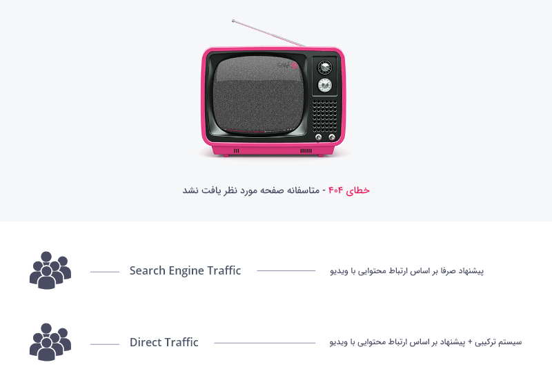 کاربری که به صفحه 404 رسیدهاست، احتمالا دنبال چیزی بوده که دیگر وجود ندارد! به همین دلیل به این نتیجه رسیدیم که به کاربر ویدیوهای جایگزینی را نشان دهیم که به خاطر آن به این صفحه هدایت شدهاست.