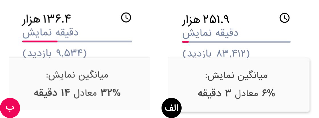 - در ویدیو الف: میانگین نمایش برای هر نفر ۳ دقیقه، معادل ۶٪ از زمان ویدیو است.