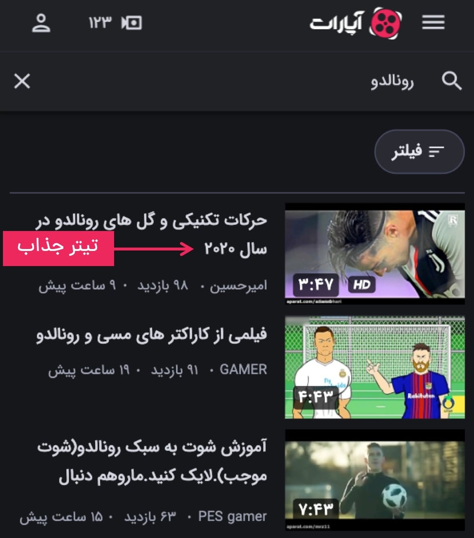 قبل از هرچیز توجه شما را به متریکی به نام “نرخ کلیک” جلب میکنم که از نسبت دیدهشدن یک ویدو به پخش همان ویدیو بدست میآید، باید بدانید در تمام مراحل، همه هدف ما بالا بردن این نرخ هم در گوگل هم در آپارات است.