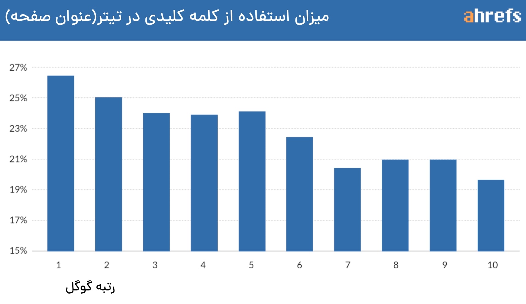 وجود کلمهکلیدی در تیتر برای موتورهای جستجو بسیار جذاب است. در عکس زیر گزارش زیر را ببینید، در واقع این گزارش میزان استفاده کلمهکلیدی در عنوان صفحات(title tag) را نشان میدهد که از سایت Ahrefs استخراج شدهاست. اما از آنجایی که در سایت آپارات هر تیتر یا عنوانی که شما برای ویدیو مینویسید عینا در عنوان صفحه دیده میشود، میتوان از این تحقیقات به طور جدی در رابطه با میزان تاثیر استفاده کلمه کلیدی در تیتر نویسی هم استفاده کرد.