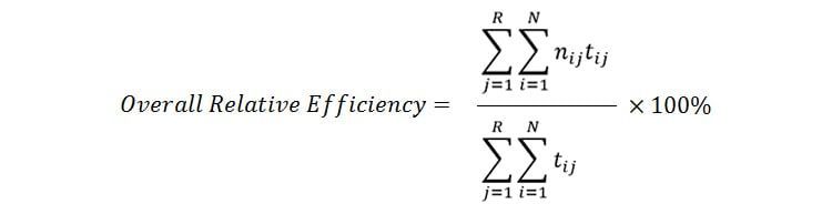 - کارایی نسبی کلی: راندمان نسبی کلی از نسبت زمان مصرفشده توسط کاربرانی که تسک را با موفقیت به اتمام رساندهاند نسبت به کل زمان گرفته شده توسط همه کاربران استفاده می کند. بنابراین می توان معادله را به صورت زیر نشان داد: