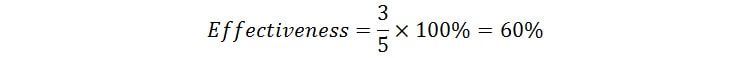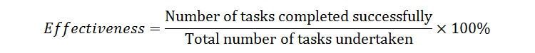 نرختکمیل: اثربخشی را می توان با اندازه گیری نرختکمیل محاسبه کرد. درصورتی که شرکتکننده در آزمون موفق به انجام یک کار شود، میزان تکمیل با اختصاص مقدار باینری "1" محاسبه می شود.و اگر موفق نشود با اختصاص مقدار باینری”0” محاسبه میشود. با استفاده از فرمول ساده زیر میتوان اثربخشی را به صورت درصد نشان داد: