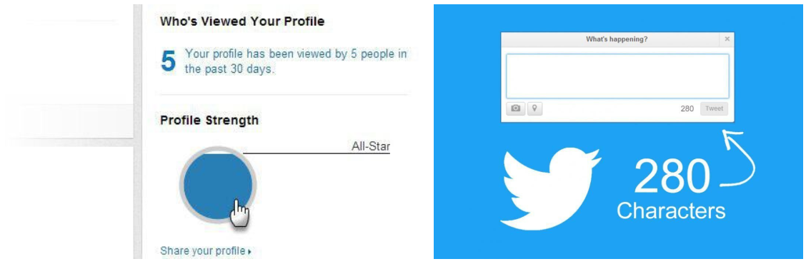 - موانع غیرضروری: محدودیت کاراکتر در توییتر برای نوشتن یا نوار میزان پیشرفت در لینکدین مثالهای خوبی برای موانع غیرضروری است که کاربر در مواجهه با این موانع و گذر کردن از آنها احساس رشد و موفقیت میکند.