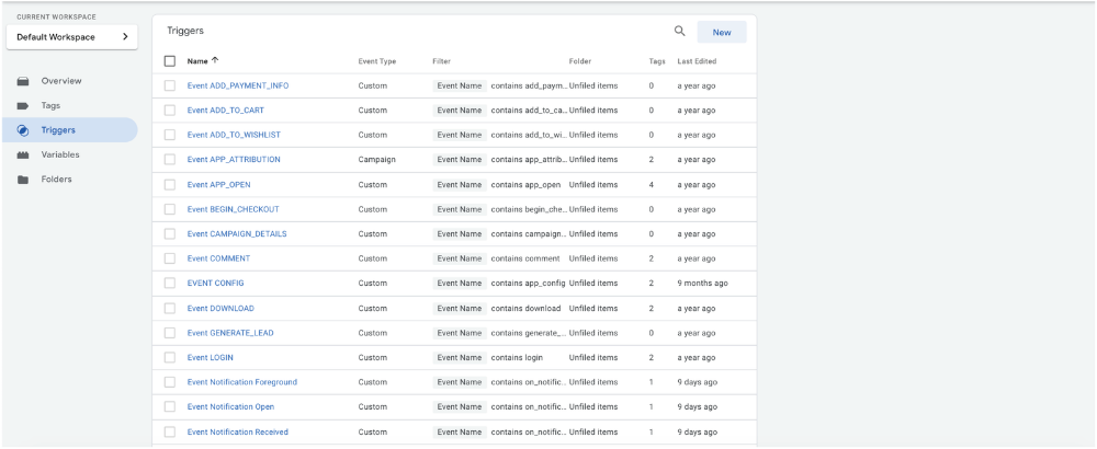 پساز اینکه در tag manager حساب خود را ساختید، میتوانید در قسمت Triggers (همانند تصویر زیر)، eventهایی که قصد دارید در بررسی رفتار کاربر صدا بزنید را مشاهده کنید. میتوانید دقیقاً همان eventهایی که در فایربیس ساختید را با همان اسم در اینجا تعریف کنید.