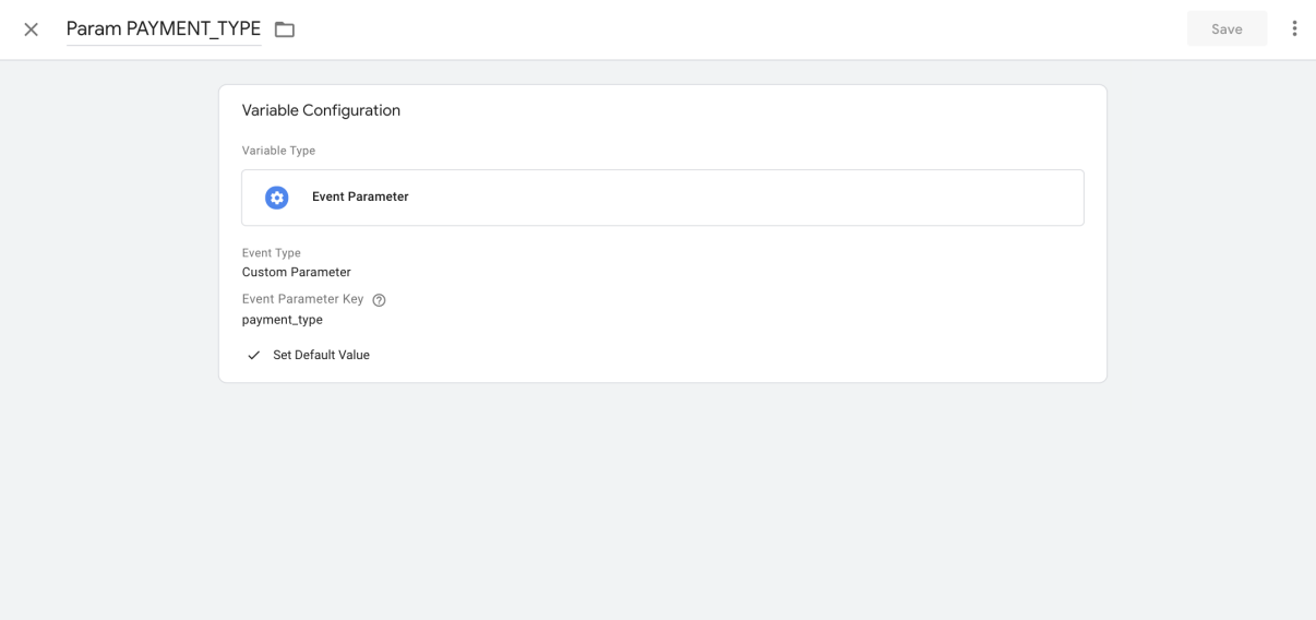 که این پارامترها را میتوانیم در بخش variables، دقیقاً به همان نامی که در فایربیس ایجاد شدند تعریف کنیم. مثلاً یکی از پارامترهای event خرید، میتواند «نوع پرداخت» باشد که با نام PAYMENT_TYPE آن را تعریف کردیم: