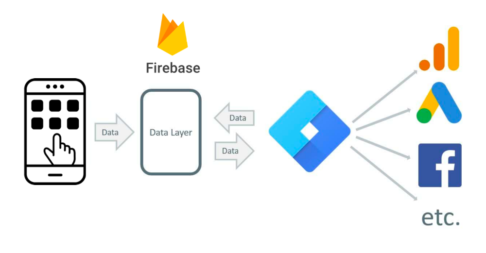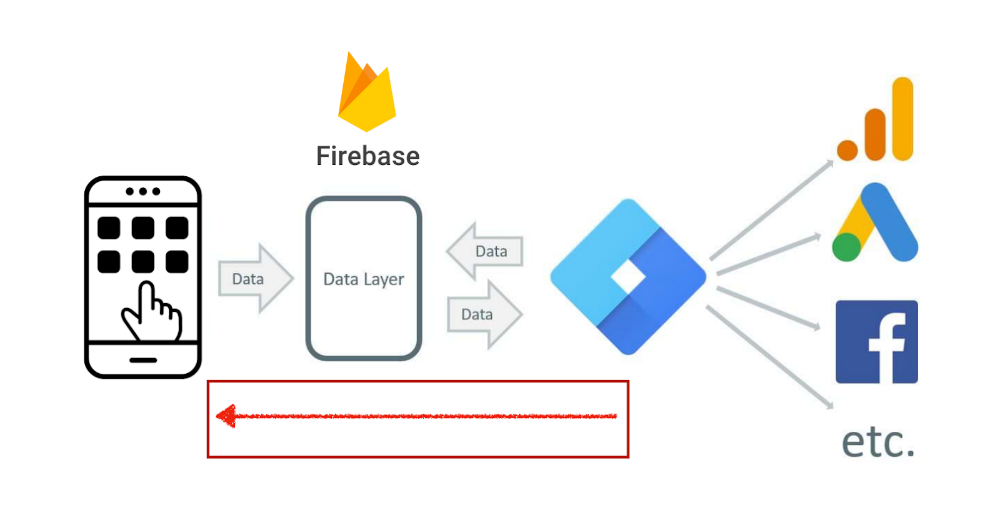فایربیس eventها (رخدادهایی که میخواهیم رفتار کاربر را در آنها بررسی کنیم) را از نرمافزار دریافت میکند، به tag manager ارسال میکند و اینجا tag manager تصمیم میگیرد که اطلاعات مربوط به هر event را به کدامیک از ابزارهای جانبی ارسال کند. ممکن است اطلاعات را به خود فایربیس نیز برگرداند (چون فایربیس نیز یکی از ابزارهای جانبی برای بررسی رفتار کاربران محسوب میشود).
