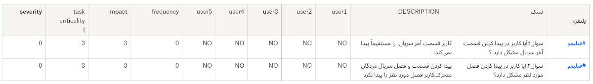 با گرفتن تست از کاربرها و همچنین تحلیل دادههای بهدستآمده، به جدول زیر رسیدیم و نتایج را بهصورت زیر ثبت کردیم.