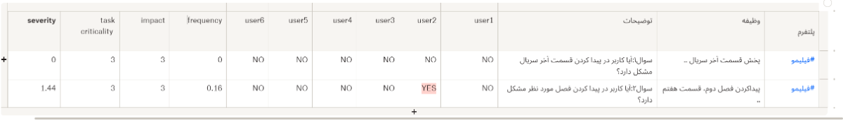 ما در تستهای کاربردپذیری، جدولهای بالا را با متریکهای موجود در آنها، طراحی کردیم تا به میزان بحرانی بودن مشکلات کاربرها پی ببریم و مشکلات بحرانیتر را در اولویت قرار دهیم.